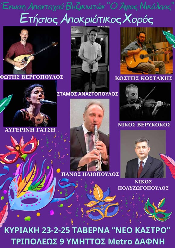 Ζωντανή μουσική: Κλαρίνα, μπουζούκια, βιολιά! Ρεμπέτικα, Σμυρναίικα, Νησιώτικα, Παραδοσιακά! Χορός μέχρι τη νύχτα, Εκπλήξεις, Δώρα, Βραβεία Μεταμφίεσης!